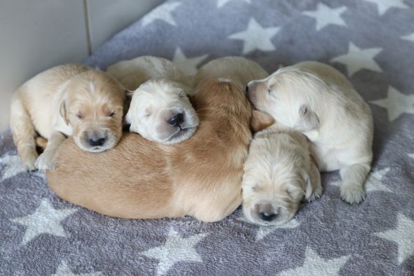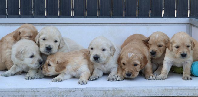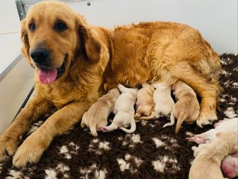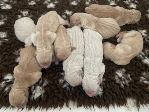 une grande portée de 9 bébés: 5 mâles et 4 femelles.